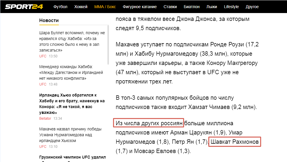 Портал Sport24.ru, рассказывая о популярности чемпионов UFC в социальных сетях, допустил грубую ошибку, приписав казахстанского бойца Шавката Рахмонова к числу российских спортсменов.