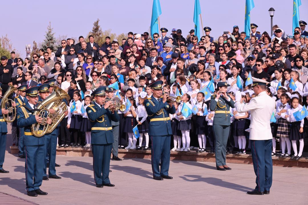 Сначала все участники акции вместе с артистами областной филармонии, фольклорно-этнографического ансамбля «Талдыкорган әуендері» и хором старшеклассников под аккомпанимент военного оркестра исполнили Государственный гимн. В это же время Государственный флаг нашей страны был поднят на вершину флагштока. Размер Государственного флага составляет 12 на 25 метров, высота шпиля – 91 метр.